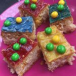 Whisk the confectioners’ sugar with lemon juice to create a thick, viscous glaze. Divide into bowls and add food coloring to match your sorted chocolate pieces. Brush the glaze onto a brick, then place 8 chocolate pieces in two parallel rows of four. Allow the icing to fully dehydrate and set for 30 minutes before moving the pieces.