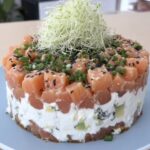 7. Repeat the sequence for a second tier, garnish with chives and sesame seeds, and carefully remove the ring before serving.